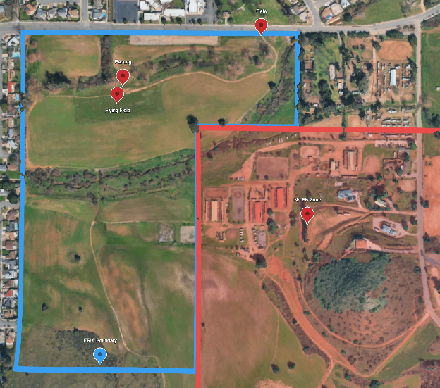 Due to the close proximity of the horse facility there are strict limits on where flight is permitted. If you violate the zones you risk losing your flight privilege at the field and possibly jeopardize the privilege to fly here for everyone. The Poway Field is approved as an FAA-Recognized Identification Area (FRIA) with the following dimensions pictured below. RC gliders within the FRIA do not need to be equipped with remote ID. Given the proximity to horses and requirement for soaring flight, absolutely no electric sport aircraft or quadcopter operations of any kind are allowed at Poway other than electric-powered gliders with limited motor run in this club-operated FRIA.